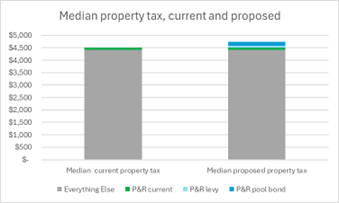 Your total property tax bill would go up by about 6–7% if both the pool bond and the Parks & Rec levy pass. Parks & Rec is currently a little over 2% of your property tax bill.